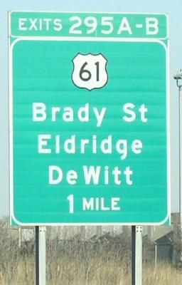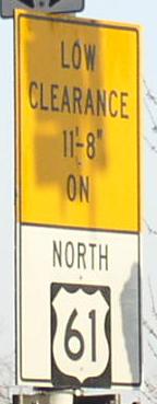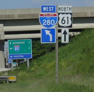 NB U.S. Rt. 61 south of Park View. NB U.S. Rt. 61 north of I-80. A BGS on EB I-80. EB I-80 near U.S. Rt. 61 in Davenport. SB U.S. Rt. 61, just south of I-80. SB U.S. Rt. 61 near the Northpark Mall. SB U.S. Rt. 61 at U.S. Rt. 61. SB U.S. Rt. 61 near Downtown Davenport. A sign for the low railroad overpass in Downtown Davenport. SB U.S. Rt. 61 near the low rail overpass in Downtown Davenport. NB U.S. Rt. 61 north of the Muscatine/Scott County Line.