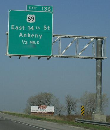 U.S. Federal Route 69 is a north-south highway in Central Polk County. This runs through the heart of Metro-Des Monies. U.S. Rt. 69 passes through the following towns in Polk County. Ankeny Carney Des Monies U.S. Rt. 69 is not multi-plexed in Polk County. U.S. Rt. 69 intersects the following highways in Polk County. Iowa State Route 160, at Ankeny. Interstate 35, near Des Monies. Interstate 80, near Des Monies. U.S. Rt. 6, at Des Monies. Iowa State Route 163, at Des Monies. Interstate 235, at Des Monies.