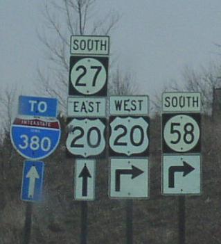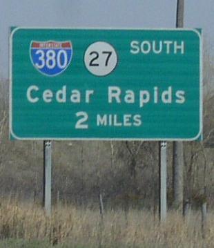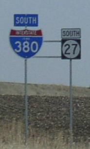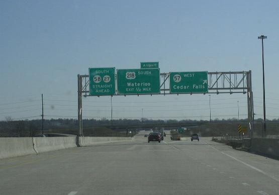 SB U.S. Rt. 218/IA St Rt 27 north of Cedar Falls. A BGS on SB U.S. Rt. 218/IA St Rt 27. SB U.S. Rt. 218/IA St Rt 27 at IA St Rt 57/58. SB IA St Rt 27/58 near Rainbow Drive. SB IA St Rt 27/58 in Cedar Falls. SB IA St Rt 27/58 near U.S. Rt. 20. A junction marker on SB IA St Rt 27/58. EB U.S. Rt. 20/SB IA St Rt 27 in Waterloo. EB U.S. Rt. 20/SB IA St Rt 27 near I-380/U.S. Rt. 218. EB U.S. Rt. 20/SB IA St Rt 27 at the ramp for SB U.S. Rt. 218. EB U.S. Rt. 20/SB IA St Rt 27 at the fly over ramp for SB I-380. A BGS on SB I-380; EB U.S. Rt. 20; SB IA St Rt 27. SB I-380; EB U.S. Rt. 20; SB IA St Rt 27 at EB U.S. Rt. 20. SB I-380/IA St Rt 27 near Gilbertville.