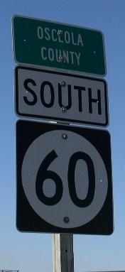 Iowa State Route 60 is a north-south highway in Western Osceola County. This is the northern most county that IA St Rt 60 passes through. IA St Rt 60 passes through the following towns in Osceola County. Ashton Sibley IA St Rt 60 is not multi-plexed in Osceola County. IA St Rt 60 intersects the following highway in Osceola County. Iowa State Route 9, near Sibley.