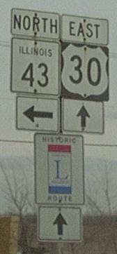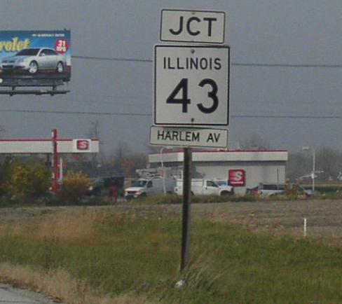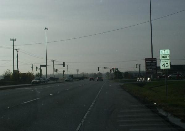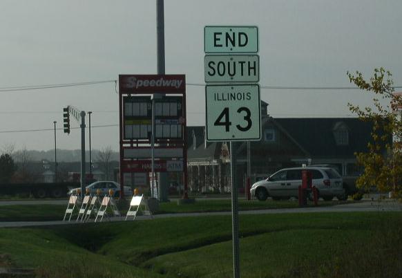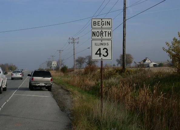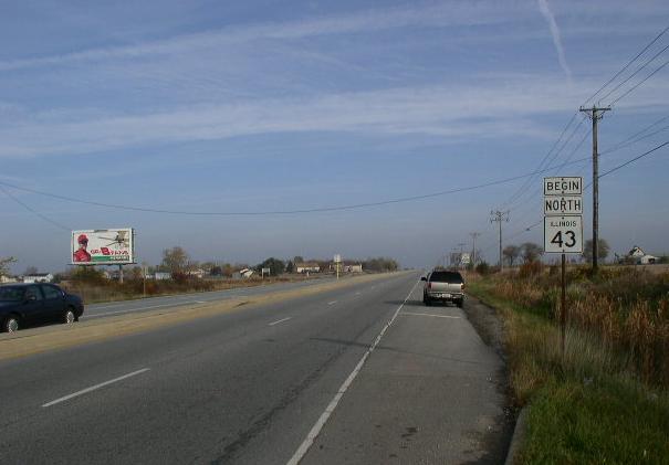 BGS on EB I-80. Heading south on IL St Rt 43. A junction marker on WB U.S. Rt. 30. The southern begin of IL St Rt 43. The southern begin marker. The southern end of IL St Rt 43 in Frankfort. The southern end marker.