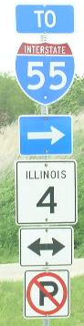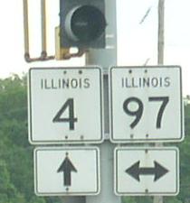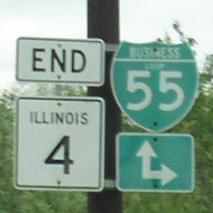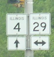 NB IL St Rt 4 south of Thayer. NB IL St Rt 4 north of Thayer. A BGS on EB I-72/U.S. Rt. 36. Another BGS on EB I-72/U.S. Rt. 36 with a guide for Capital Airport. SB IL St Rt 4 near Walbash Ave. SB IL St Rt 4, just south of IL St Rt 97. A junction marker on SB IL St Rt 97. SB IL St Rt 4 just west of IL St Rt 29 near Capital Airport. NB IL St Rt 4 near Peoria Road. A Sangamon County mile sign near the state fair grounds. Signage on a access road at the state fairgrounds. Overhead sign on SB BUSN. Loop I-55 at the intersection of Peoria Road/Color Plant Road/ and Veterans Parkway in Springfield. A BGS on SB I-55. This is the start of IL St Rt 4. BGS indicating the end to Veterans Parkway at Peoria Road. Northern end marker.