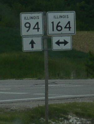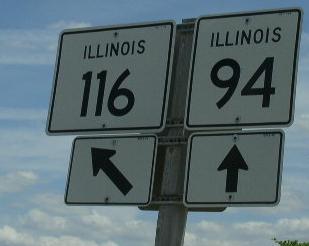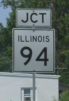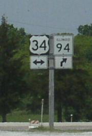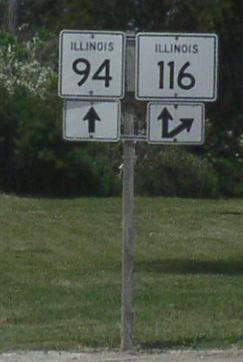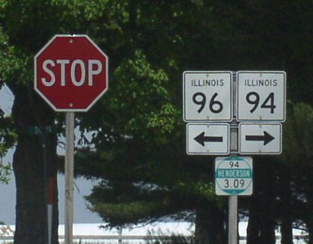A Henderson County mile marker. NB IL St Rt 94 north of the Hancock/Henderson County Line. NB IL St Rt 94 north of Terre Haute. NB IL St Rt 94 near Raritan. NB IL St Rt 94 near Stronghurst. NB IL St Rt 94/WB IL St Rt 116 near Biggsville. NB IL St Rt 94/WB IL St Rt 116 near U.S. Rt. 34. WB U.S. Rt. 34/SB IL St Rt 94 west of Biggsville. A junction marker on WB U.S. Rt. 34. NB IL St Rt 94 south of IL St Rt 164.