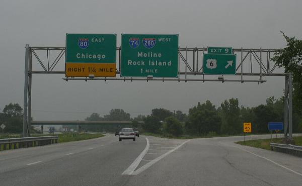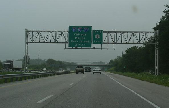 WB I-80 near I-74/280 on the southeast side of the Quad-Cities. This interchange is a cloverleaf, with WB I-80 going from west to north. I-74 going from north to west. I-280 coming east and ending.