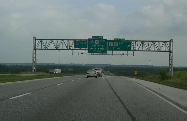 Interstate 80 runs due east and west through the state, with exception of turning and running north-south to form the eastern leg of the belt-loop around the Quad-Cities before turning east-west and entering Iowa.