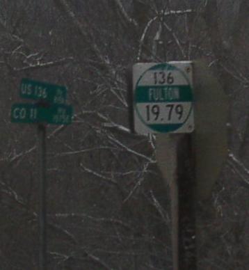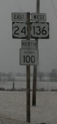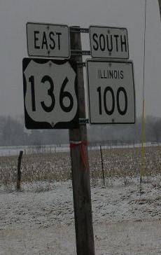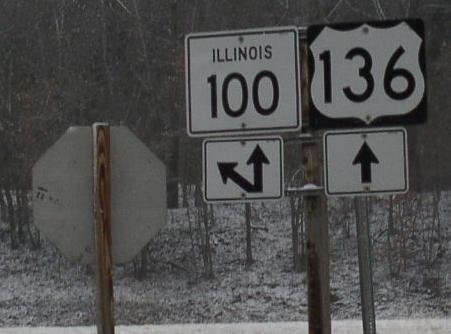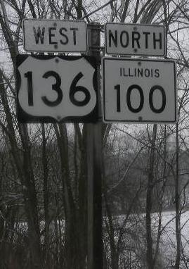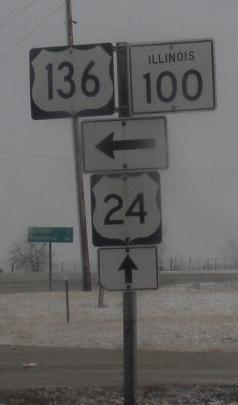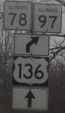 EB U.S. Rt. 24/WB U.S. Rt. 136/NB IL St Rt 100 near Enion. WB U.S. Rt. 136/NB IL St Rt 100 near Enion. A Fulton County mile marker. EB U.S. Rt. 136; SB IL St Rt 78/97 at the Illinois River.