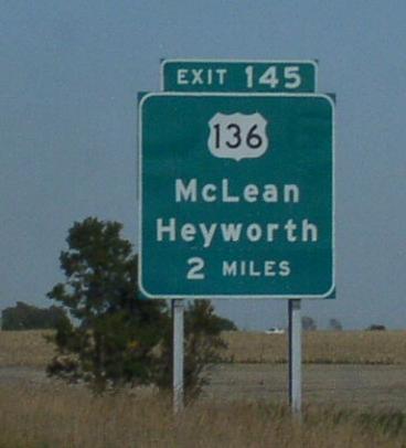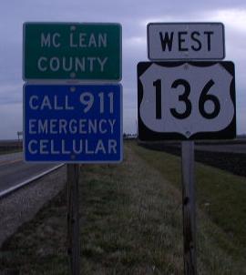 EB U.S. Rt. 136 at the Mc Lean/Logan County Line. EB U.S. Rt. 136 west of Mc Lean. A EB guide marker. A street sign in Mc Lean. EB U.S. Rt. 136 at the UPRR crossing in Mc Lean. EB U.S. Rt. 136 near I-55 in Mc Lean. A BGS on NB I-55. A mileage chart on EB U.S. Rt. 136. EB U.S. Rt. 136 west of Heyworth. A BGS on NB U.S. Rt. 51. WB U.S. Rt. 136 west of I-74. A BGS on EB I-74. EB U.S. Rt. 136 near the Champaign/Mc Lean County Line. WB U.S. Rt. 136 at the Champaign/Mc Lean County Line.