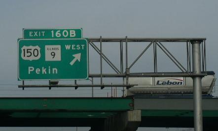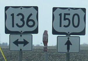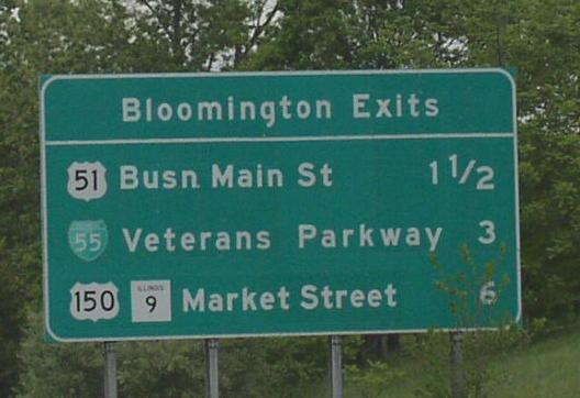 EB U.S. Rt. 150 in Carlock. A BGS on WB I-74. Sign at the intersection of I-74 and U.S. Rt. 150 near Yuton. The portion of U.S. Rt. 150 from IL St Rt 9 to I-74 is know at the Mitsubishi Motorway, because it sereves as the main in and out for the Mitsubishi Plant at Normal. NB U.S. Rt. 150 near the Mitsubishi Plant. EB U.S. Rt. 150/IL St Rt 9 on the westside of Bloomington. A old BGS on NB I-55/WB I-74/NB U.S. Rt. 51 in Bloomington. (2003) Another old BGS on NB I-55/WB I-74/NB U.S. Rt. 51. (2003) A new BGS on NB I-55/WB I-74/NB U.S. Rt. 51. (October, 2004) A mileage BGS on WB I-74. A junction marker on NB BUSN U.S. Rt. 51. WB U.S. Rt. 150 near Hamilton Road on the southside of Bloomington. EB U.S. Rt. 150 east of Bloomington. EB U.S. Rt. 150 near Towanda-Barnes Road. EB U.S. Rt. 150 west of Downs. EB U.S. Rt. 150 east of Downs. EB U.S. Rt. 150 west of Le Roy. Street sign at the Mc Lean/De Witt County Line.
