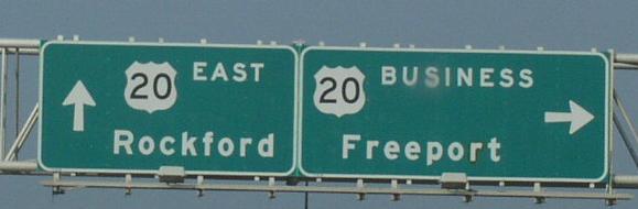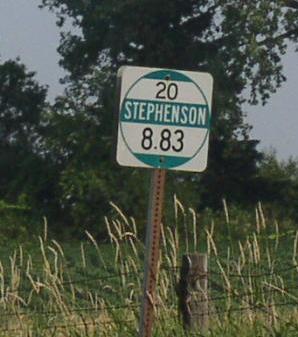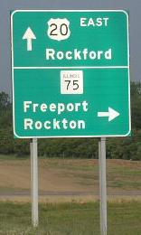 Branches of U.S. Rt. 20 in Stephenson County. A junction marker on SB IL St Rt 73. EB U.S. Rt. 20 near Eleroy. A Stephenson County mile marker. EB U.S. Rt. 20 west of Freeport. A guide BGS on NB IL St Rt. 26. EB U.S. Rt. 20 east of IL St Rt 26. (June, 2005) EB U.S. Rt. 20 east of IL St Rt 26. (April, 2007) EB U.S. Rt. 20 near Ridott.