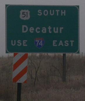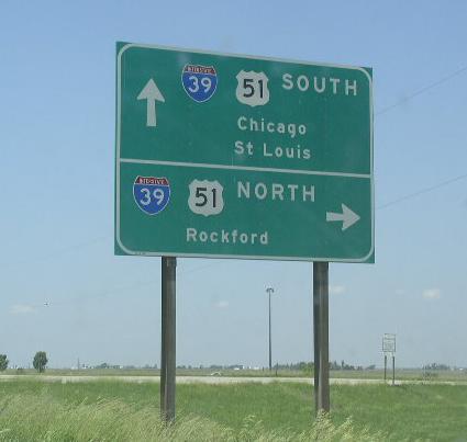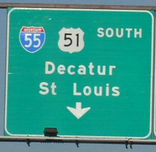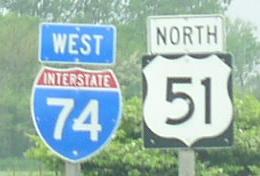 Branches of U.S. Rt. 51 NB U.S. Rt. 51 south of Heyworth. A guide sign on EB U.S. Rt. 136. NB U.S. Rt. 51 at Heyworth. SB U.S. Rt. 51 near Heyworth. NB U.S. Rt. 51 just south of Bloomington. NB U.S. Rt. 51 at the southside of Bloomington. A BGS on WB I-74. Another BGS on WB I-74. NB U.S. Rt. 51 at I-74, on the southside of Bloomington. WB I-74/N.B. U.S. Rt. 51 on the southside of Bloomington, near the U.S. Rt. 51/BUSN. U.S. Rt. 51 interchange. A BGS on NB I-55. NB I-55/WB I-74/NB U.S. Rt. 51 on the westside of Bloomington. NB I-55/U.S. Rt. 51; WB I-74 at U.S. Rt. 150/IL St Rt 9. A BGS on WB U.S. Rt. 150/IL St Rt 9. A BGS on EB U.S. Rt. 150/IL St Rt 9. NB I-55/U.S. Rt. 51; WB I-74 north of U.S. Rt. 150/IL St Rt 9. A overhead sign on NB I-55/WB I-74/NB U.S. Rt. 51. Another over head BGS on NB I-55/WB I-74/NB U.S. Rt. 51. A guide sign on SB I-55/EB I-74/SB U.S. Rt. 51 in Normal. NB I-55/U.S. Rt. 51 at I-74 in Normal. A BGS on EB I-74. A BGS on EB I-74. This replaced the one in the picture above. (December, 2004) A overhead sign on NB I-55/U.S. Rt. 51. NB I-55 at I-39/U.S. Rt. 51. Directional signs at the interchange of I-39/U.S. Rt. 51 and BUSN. U.S. Rt. 51 north of Normal. A guide sign on BUSN U.S. Rt. 51 at the junction of I-39/U.S. Rt. 51. Looking north at I-39/U.S. Rt. 51 at BUSN. U.S. Rt. 51 north of Normal. A BGS on SB IL St Rt 251. NB I-39/U.S. Rt. 51 at the Mc Lean/Woodford County Line.