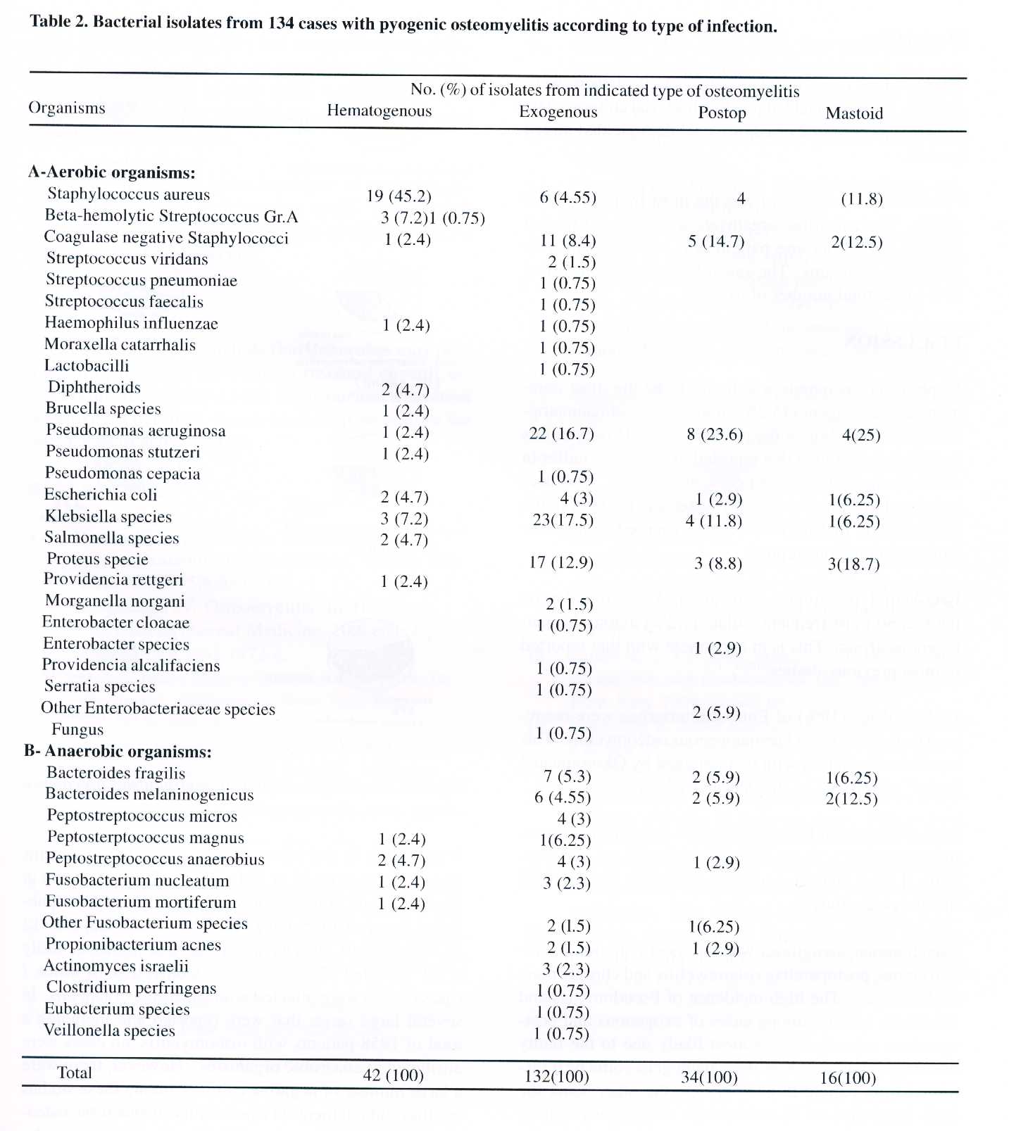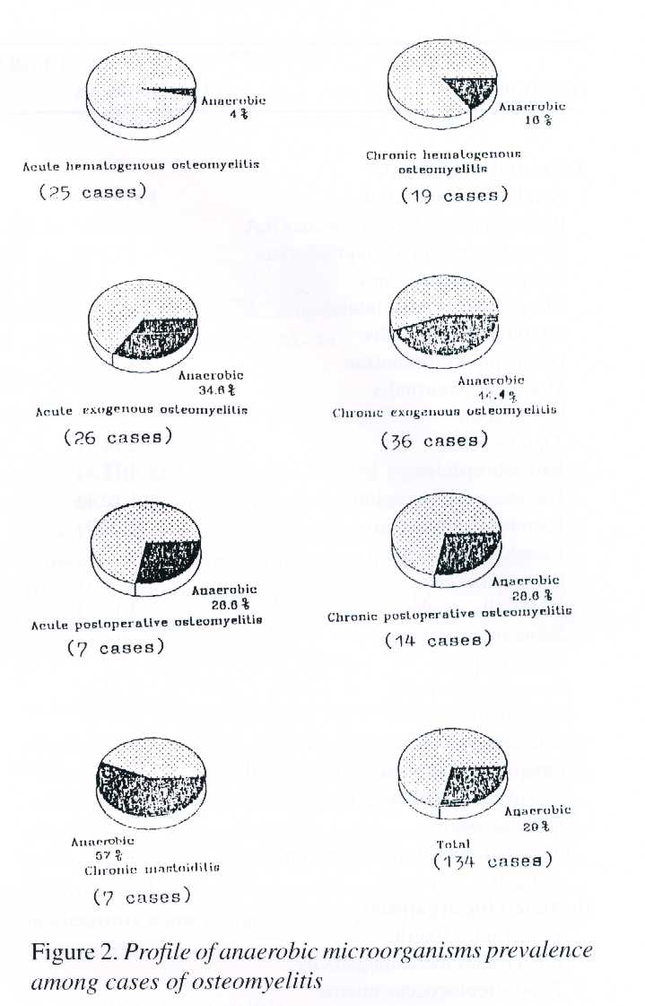 Results: The study included 134 patients with osteomyelitis. The cases were divided clinically into 4 main groups: haematogenous, exogenous, postoperative and mastoiditis. Staphylococcus aureus was the most common causative agent in haematogenous osteomyelitis whereas Pseudomonas sp. were the most common causative organisms in postoperative and mastoiditis groups of bone infection. The total number of isolated bacteria was 224, of which 50 (22%) were anaerobes. These anaerobes were isolated from 39 (29%) of 134 patients. The anaerobic organisms were found most frequently in the cases of chronic mastoiditis (57%) and erogenous osteomyelitis (40%).