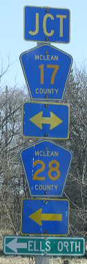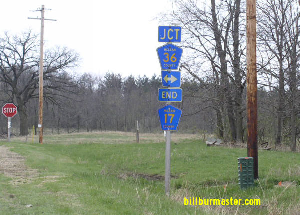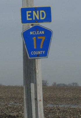 Mc Lean County Highway 17 is a north-south highway from Cooksville to the Moraine View State Park near Le Roy. McLCH 17 passes through the following towns in Mc Lean County. Cooksville Ellsworth McLCH 17 intersects the following highways in Mc Lean County. Illinois State Route 165, near Cooksville. Illinois State Route 9 north of Ellsworth. Mc Lean County Highway 28, near Ellsworth. Mc Lean County Highway 36, at the Moraine View State Park. McLCH 17 was multi-plexed in Mc Lean County. Mc Lean County Highway 28, near Ellsworth.