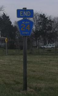 Mc Lean County Highway 24 is a east-west highway in Western Mc Lean County. This runs from Illinois State Route 122 to the Mc Lean/Tazewell County. Mc LCH 24 does not passes through any towns in Mc Lean County. Mc LCH 24 intersects the following highway in Mc Lean County. Illinois State Route 122, near Danvers.