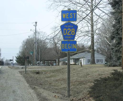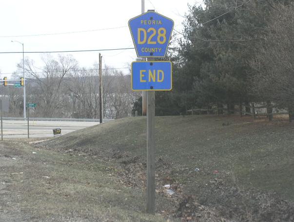 Peoria County Highway D28 is a east-west highway in East-Central Peoria County. This runs to the north of the Greater-Peoria Metro Area. It connects Dunlap to Illinois State Route 29. PCH D28 passes through the following town in Peoria County. Dunlap PCH D28 intersects the following highways in Peoria County. Illinois State Route 29, near Peoria. Peoria County Highway R60, near Peoria. Illinois State Route 40, near Alta. Peoria County Highway D27, at Dunlap. Illinois State Route 91, at Dunlap.