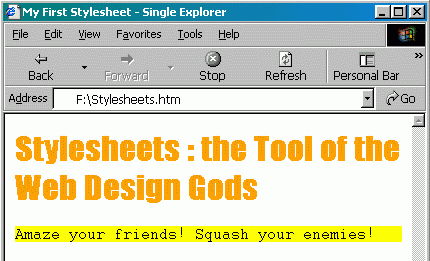 <H1 STYLE="color: orange; font-family: impact">Stylesheets: The Tool of the Web Design Gods</H1>