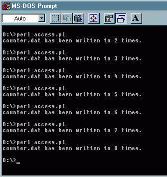 احفظ هذه العينة من الشفرة بإسم access.pl و شغلها مرات قليلة من نافذة الدوس (هل ما زلت تذكر كيف؟) ، اكتب الأمر perl ثم اترك مسافة ثم اكتب اسم البرنامج المراد تشغيله و تذكر أنك يجب أن تكون في نفس المجلد الذي يوجد فيه البرنامج ، و توضح الصورة التالية ما يجب أن تراه :