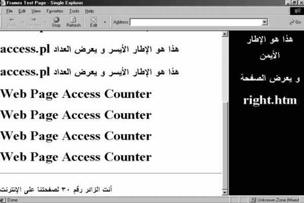 المهم أن الصفحة الأولى في الموقع سوف تكون منفصلة عن الصفحات الأخرى ، هي فقط تشير إلى صفحتين أخرتين ليملآ الفراغ . و يمكنك أن تجعل برنامج العداد access.pl هو إحدى النافذتين بدون أن تتكلف تغيير عنوان موقعك أو حتى رؤية الزوار لهذا الإسم الغريب بالنسبة لهم . و الصورة التالية توضح وضع برنامج العداد access.pl في صفحة إطارات :