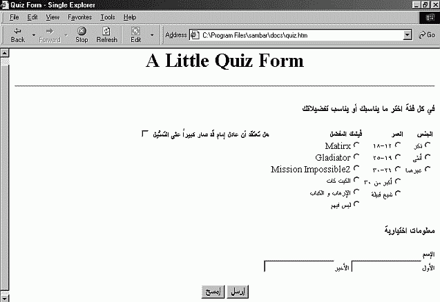 الآن بعد أن فهمت عمل ما أضفت من سطور ، شغل المتصفح (تأكد من تشغيل Sambar Server) و في صندوق العنوان اكتب localhost/docs/quiz.htm ثم املأ النموذج بما ترغب و اضغط زر إرسل ، و سوف تكون النتيجة في الغالب مشابهة لهذه :