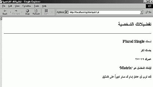 احفظه بإسم quiz.pl في فهرس cgi-bin ثم شغل النموذج من المتصفح و املأه و اضغط على زر إرسل ، سترى شيئاً مثل هذا :