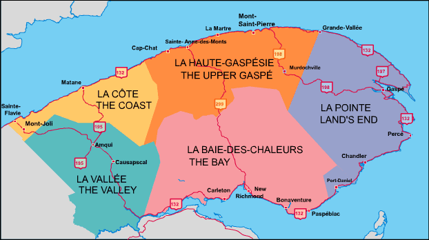 Moi je viens d'la partie en jaune entre Sainte-Flavie et Matane.On appele ca les portes de la Gaspésie car c'est le début de vacances inoubliable.J'ai toujours pensée que ca ne vallait pas la peine d'aller en Floride pour voir de beaux paysages et la MER!Pourquoi ne pas aller a quelques heures de route dans notre pays pour voir pratiquement la meme chose...(personnellement)