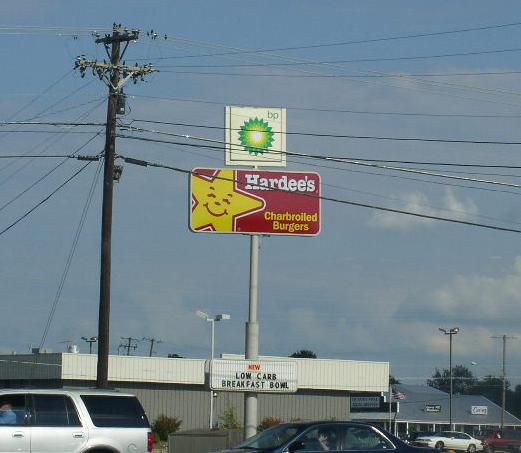 | The new sign for a BP station and a Hardee's in Hodgenville, KY. (August, 2004) |