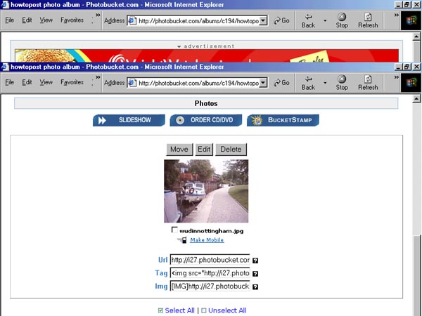 The address in the lower window must be copied, or written EXACTLY the same into your new post, where you want to display the image. On a forum for example. If you click the edit button above the photo, you can resize it, so it isn't too wide for the forum window, and requires horizontal scrolling. |