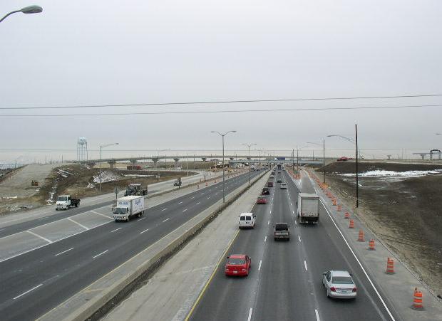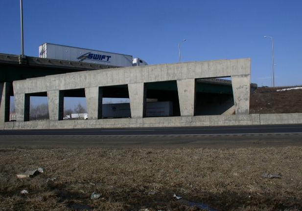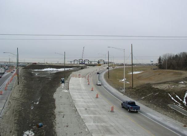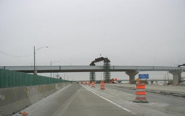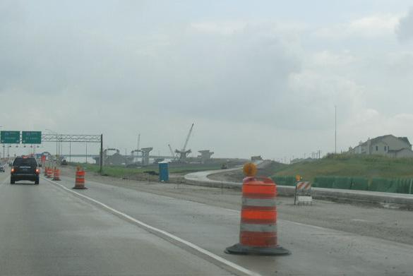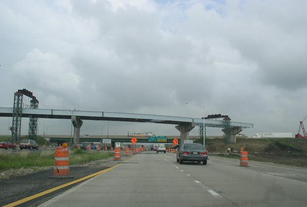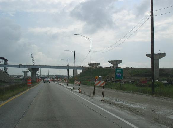 | The ramp from SB I-355 to SB I-55. The piers for the ramp from SB I-55 to SB I-355 are to the right. The ramp for traffic from SB I-355 to NB I-55 is ahead. (Sept. 2006) |