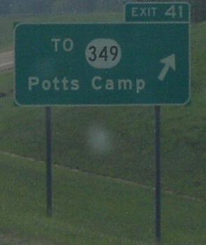Mississippi State Route 349 is a north-south highway in Southeastern Marshall County. This runs within the Holly Springs National Forest. It starts at Mississippi State Route 178, at Potts Camp to the Marshall/Benton County. MS St Rt 349 passes through the following town in Marshall County. Potts Camp MS St Rt 349 is not multi-plexed in Marshall County. MS St Rt 349 intersects the following highway in Marshall County. Mississippi State Route 178, at Potts Camp.