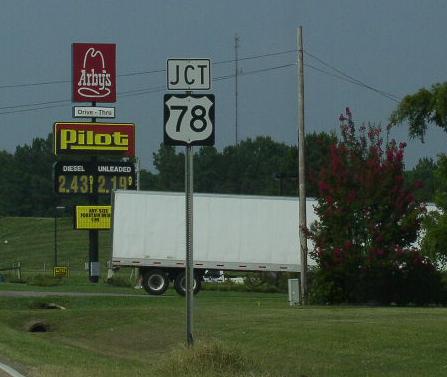 A junction marker on NB MS St Rt 15. WB U.S. Rt. 78 at New Albany. WB U.S. Rt. 78 near the Hell Creek W.M.A. WB U.S. Rt. 78 near Myrtle. WB U.S. Rt. 78 near the Union/Benton County Line.