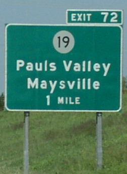 Oklahoma State Route 19 is the main east-west highway across Garvin County. This highway runs mostly along the northern part of the county, except briefly where it dips down into Pauls Valley. OK St Rt 19 passes through the following towns in Garvin County. Stratford Pauls Valley Maysville Lindsay OK St Rt 19 is multi-plexed in Garvin County. U.S. Rt. 177, near Stratford. Oklahoma State Route 76, near Lindsay. OK St Rt 19 intersects the following highways in Garvin County. U.S. Rt. 177, at Stratford. U.S. Rt. 177, at Stratford. Oklahoma State Route 133, near Pauls Valley. U.S. Rt. 77, at Pauls Valley. Interstate 35, at Pauls Valley. Oklahoma State Route 74, at Maysville. Oklahoma State Route 59B, near Lindsay. Oklahoma State Route 76, at Lindsay. Oklahoma State Route 76, near Lindsay.