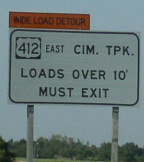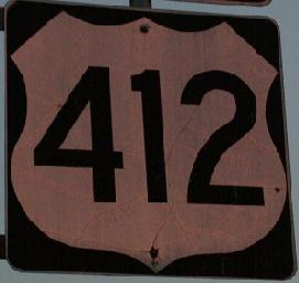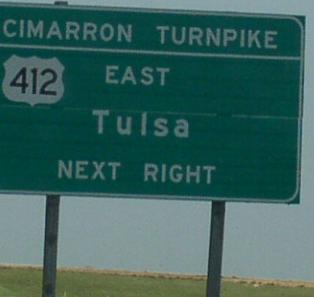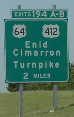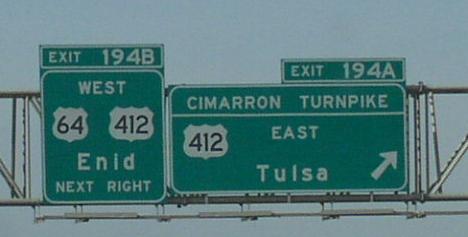 U.S. Federal Route 412 runs east-west across much of Noble County. Through Noble County, most of this highway runs on the Cimarron Turnpike. This highway is multiple lanes through the entire county. U.S. Rt. 412 passes through the county twice. U.S. Rt. 412 does not pass through any towns in Noble County. U.S. Rt. 412 is multi-plexed in Nobel County. U.S. Rt. 64, from near Ceres to the Garfield/Noble County Line. U.S. Rt. 412 intersects the following highways in Nobel County. U.S. Rt. 64, near Lela. U.S. Rt. 177, near Morrison. U.S. Rt. 77, near Red Rock. Interstate 35, near Ceres. U.S. Rt. 64, near Ceres. Cimarron Turnpike, near Ceres.