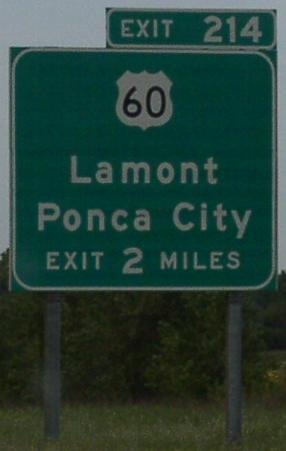 U.S. Federal Route 60 is the main east-west highway across Kay County. Across the Arkansas River, this highway is multi-lane. Then again from near Ponca City to Interstate 35. U.S. Rt. 60 does not pass through any towns in Kay County. U.S. Rt. 60 is multi-plexed in Kay County. U.S. Rt. 77, from near Ponca City to near Tonkawa. U.S. Rt. 177, from near Ponca City to near Tonkawa. U.S. Rt. 60 intersects the following highways in Kay County. U.S. Rt. 177, near Ponca City. U.S. Rt. 77, near Ponca City. Oklahoma State Route 156, near Ponca City. U.S. Rt. 77, near Tonkawa. U.S. Rt. 177, near Tonkawa. Interstate 35, near Tonkawa.