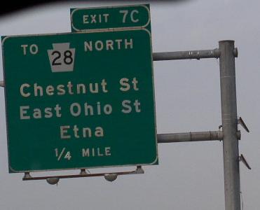 A BGS on NB I-279/TK U.S. Rt. 19. A BGS on SB PA St Rt 28. A road work sign on NB PA St Rt 28. (May, 2004) NB PA St Rt 28 near Etna. NB PA St Rt 28 near Aspinwall. NB PA St Rt 28 near Cheswick. NB PA St Rt 28 near Taretum. A set of guide markers in Tarentum.