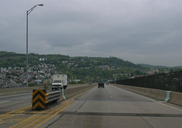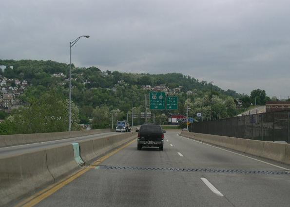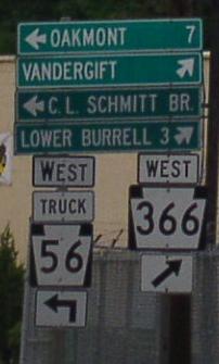 A set of guide markers NB PA St Rt 366. A BGS on NB PA St Rt 380. WB PA St Rt 366 near Drennen. WB PA St Rt 366; EB TK PA St Rt 56 in New Kensington. Looking at the Allegheny River Bridge on PA St Rt 366 from the New Kensington Bluffs. WB PA St Rt 366 at the Allegheny River. WB PA St Rt 366 crossing the Allegheny River.