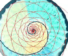 (Right) The different wavelengths as spirals become white when they converge at the source and overlap.![]()