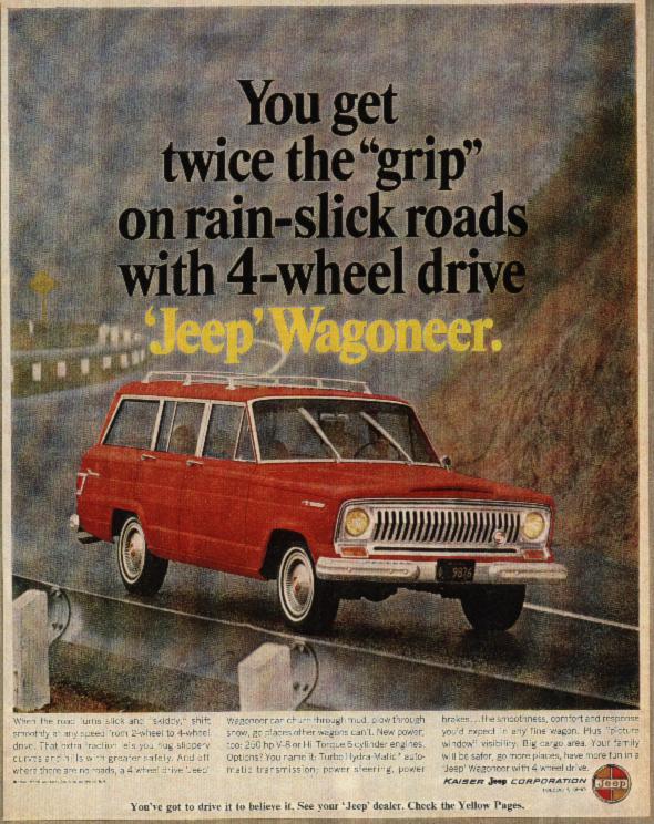 "When the road turns slick and "skiddy", shift smoothly at any speed from 2-wheel to 4-wheel drive. That extra traction let's you hug slippery curves and hills with greater saftey. And off where there are no roads, a 4-wheel drive 'Jeep' Wagoneer can churn through mud, plow through snow, go places other wagons can't. New power too:250 hp V-8 or Hi-Torque 6 cylinder engines. Options? You name it: Turbo Hydra-Matic automatic transmission; power steering, power brakes...the smoothness, comfort and response you'd expect in a fine wagon. Plus "picture window" visibility. Big cargo area. Your family will be safer, go more places, have more fun in a 'Jeep' Wagoneer with 4-wheel drive."