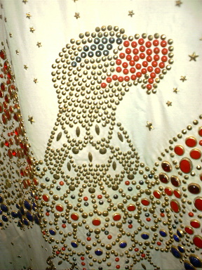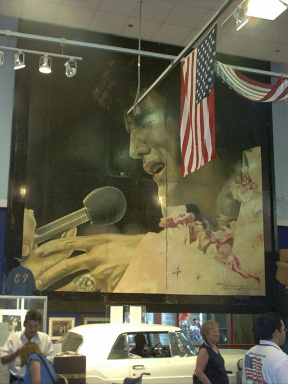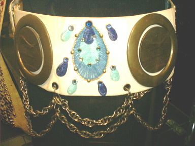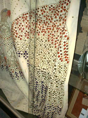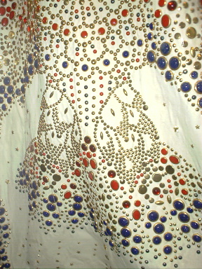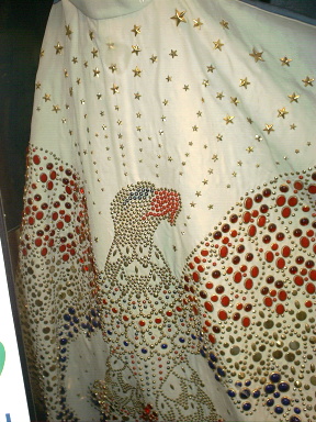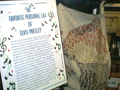 These pictures were taken 4-21-02 at Gallery Furniture in Houston, TX. The owner, Jim MacInvale is an Elvis fan. These items are on display just inside the front door of this HUGE furniture store. The cape and belt are in a glass showcase and you can walk right up to it. The car unfortunately is surrounded by stuff so it was hard to get a good picture. The car is not protected at all, you can touch it and even reach inside and grab the steering wheel. There are other Elvis items, dolls, bills of sale, etc. I made these pictures 3" X 4" so they wouldn't take too long to load on the web...the originals are 10" X 12." If you are interested in the larger pics email me and let me know...I could put them on a CD-ROM and sell them to you for $10 including shipping. If there is a particular detail of the cape or belt you want to see I could go back to Gallery and try to get it. The large round metal discs on the peacock belt are raised images of a bird...they are very hard to see in a picture.