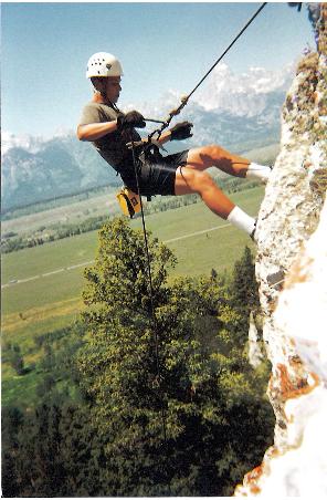 This year the Green Guys and Red girls spent two days rock climbing. On the first day we hiked two miles to cascade canyon and spent the day climbing there. Peter Ekama was able to climb a new climb and named it "Outer Limits". The two main climbs for certification there were "Bullwinkle" and "Open Book". The second day we went to Black Tail Butte. From there you can see airplanes flying below or at your level on thier decent to Jackson Hole Airport. There is the hardest climb offered at Tetons Challenger Camp. "Muster Buster". This year only Eli Terry and Peter Ekama were able to climb it on the day we were there. "Easy On The Eyes", "Mucho Guano", and the rappel are also offered there.