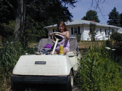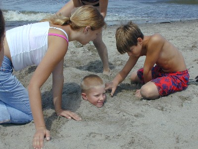 Burying Garret in the sand at Lake Ontario. Carrie on the Golf Cart