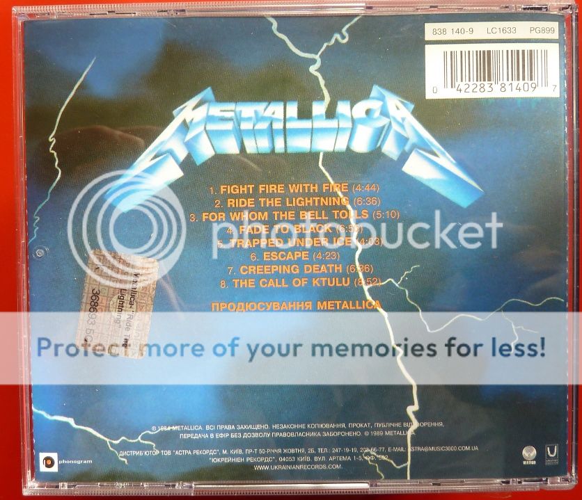 | Ride The Lightning | MFN | 1984 | England | CD MFN 27 | 8 | RED title on cover, backcover without Barcode, address and country;no country on disc, black writing on disc, italic title on disc, Carnaby address on disc |