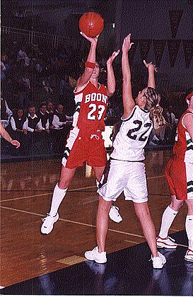 Sarah Trowbridge, one of four starting seniors on the Boone squad, shoots in the heartbreaking loss to Dowling in March. Trowbridge was the leading scorer and rebounder for Boone this past season.