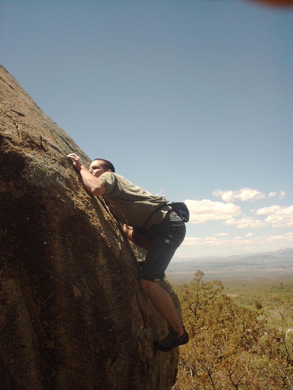 Mark, getting ready to move onto the mossy slab on King Fuzzie's Harry Back...