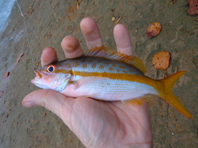 ![]() Since the snorkeling was so lousy I had to catch the fish to get a good look at them. I caught 4 different species and I have no idea what any of them were. Most were small but I did hook into something big that broke me off in the rocks.   |