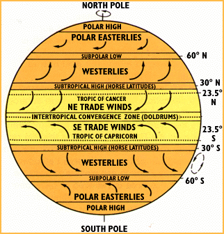Global circulation patterns. Non-polar deserts form in the yellow areas.