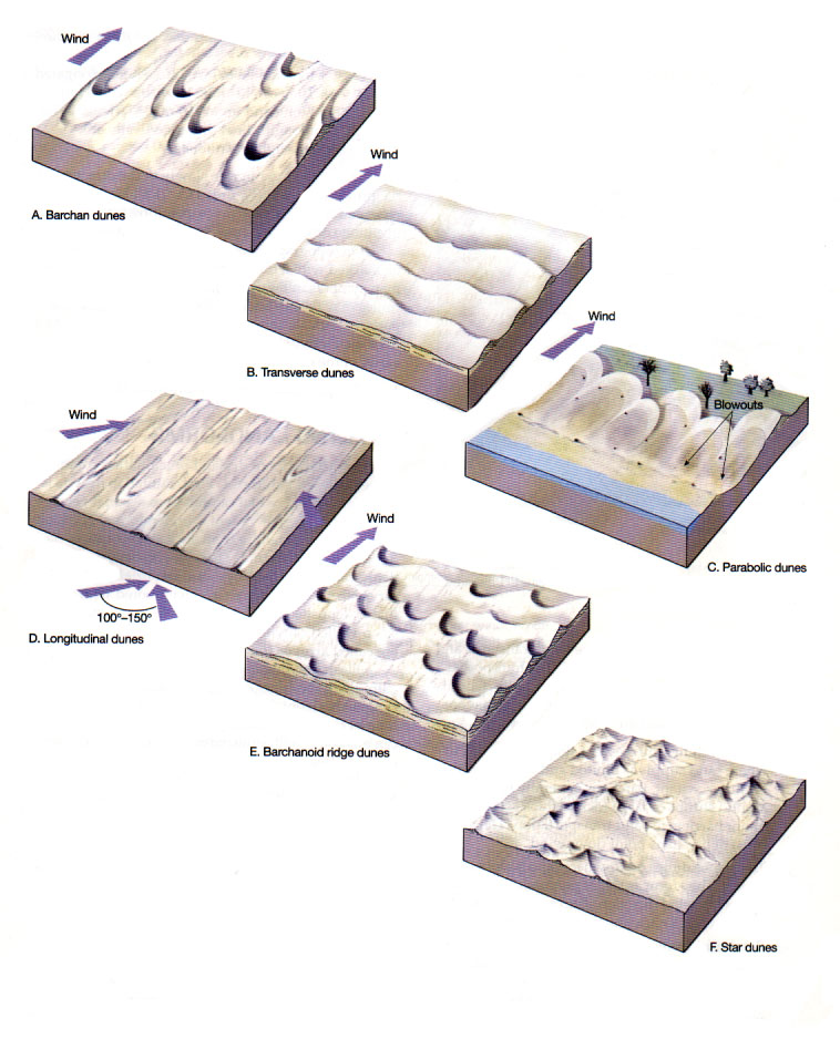 E - Barchanoid ridge dunes are barchan dunes that form ridges perpendicular to wind direction.