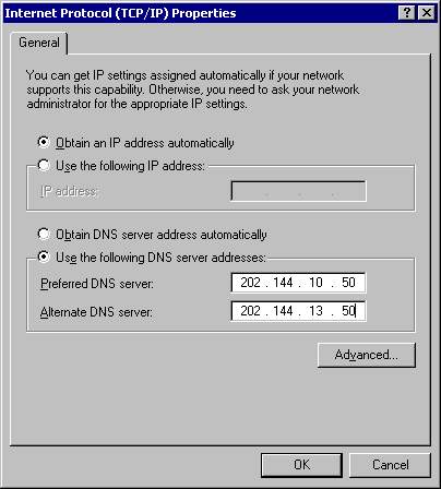 7. Click on Properties , the TCP/IP Properties box will come .Select " Use the following DNS server addresses " and enter the Preferred DNS server and Alternate DNS server address.