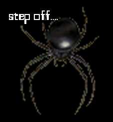 bordan doesn't have many friends other than us at acc, but soon he found his perfect match..."what? bordan has a perfect match?" yeah, we don't talk about her much here at acc, mostly because we've never written much on bordan...the one word that bordan says that doesn't make sense if you had no idea he had a match..."typsy", of course, if it rings a bell..you're probly an acc member...either that or some kind of weird beta tester that i never knew about....and in that case, thanks for beta testing! send in the report any time....because i care....or something...typsy is almost as deranged as bordan...her eyes glimmer black, yeah, you guessed it..typsy is a black widow spider with mood swings...i told you, ai...ok? ai? so, don't *even* be surprised that she has mood swings...loser...
