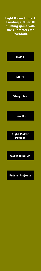 I would like, sometime in the future for a 2D or 3D fighting game to be made using the characters from Everdark. I do not have neither the hard drive space nor the computing power to complete this task right now. If another would take on this task, it would be highly appreciated. Email me and tell me what kind of "workers" you will need and I will be happy to recruit some for you. You can use any fight maker as long as it's not too obscure (some people have to own the program which you are using to make it). I might have someone who will be willing to make it using Flash, but they are not committed yet. Please email me, I need all the help I can get. You must have some knowledge of making fighting games. I suggest using Mugen, Fight Maker 95, Project 2 (hasn't been released), or Street Fighter Remake [1 or 2(2 hasn't been released)]. Thanx for your help,