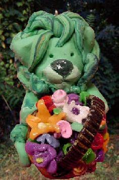 This is a slightly manipulated image, obviously. This is the first of my "cousins" he's only about 2 or 3 inches tall. His basket is actual wicker, and is filled with tiny polymer clay flowers. Theis particular piece has since vanished, but remains one of my favorite simple works
