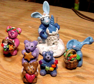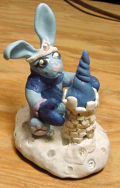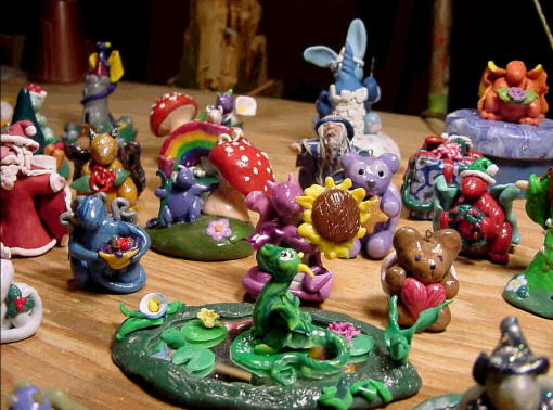 This picture, taken a few moments after the one above, was specifically taken of my cute non-dragon critters. I personally cannot help but think of them as "Cousins" This is a "Care Bears" reference, for anyone who wonders. The Care Bear Cousins were the adorable little fuzzy critters who were NOT bears. Now, most of these ARE bears, but since dragons are my dominant species choice for subject, these became the cousins. I will post a picture soon of the pale bunny with the castle. That's "Ping the Snowbunny." Ping was a piece commissioned by a friend's beau as a gift. (During a recent snowstorm, when she was out reveling in the snow, she had declared herself to be "The Snowbunny, Ping." Hence the creation. A small note, Ping's castle was built one tiny polymer-clay brick at a time, and the little stick in her mittened paw is meant to be part of a flag (I glued a paper flag on later.)